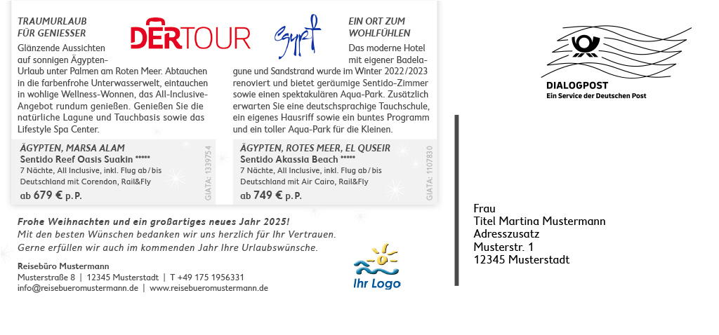 Die Rückseite des Postkartenmailings ist bei allen drei Motiven identisch und wird mit euren Reisebürodaten als Absender (auf Wunsch auch inkl. Logo) und den Empfängerdaten eurer Kunden personalisiert.